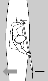 Исходное положение: плечи развернуты вокруг позвоночника примерно на 45°, корпус наклонен вперед тоже на 45°. Весло входит в воду и движется вдоль борта (для толкающего гребка). Хват весла во все время гребка практически вертикален, кисть верхней руки движется над рабочим бортом. Основное усилие развивается двумя одновременными движениями корпуса:Прямой гребок со своей руки