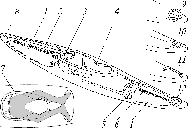 ![]() Оборудование каяка: 1 — емкости непотопляемости, 2 — задний пиллерс, 3 — спинная стропа, 4 — коленные (бедренные) упоры, 5 — пяточный упор, 6 — носовой пиллерс, 7 — безопасный кокпит, 8 — дренажный клапан, 9, 10, 11, 12 — носовая рукоятка (различные варианты). |