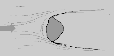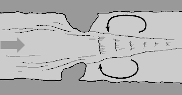 Если две примерно равновеликие струи сходятся навстречу друг другу, то вода, поступающая на их границу с обеих сторон, не имеет другого выхода, кроме как вниз. На такой сбойке всегда образуется вертикальная турбулентность. Подобные структуры течений возникают при слиянии проток, впадении притоков, на границе поганок.Сбойки струй
