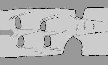 Разглядеть в пороге эти V-образные структуры обычно бывает нетрудно, если смотреть с берега. Но для того, чтобы бегло читать их, глядя из каяка, требуется определенная практика. Умение быстро находить их очень важно, потому что "языки" указывают вам глубокие и чистые проходы, а "усы" - скрытые камни. В простых порогах обычно имеется всего один "язык", и гребцу достаточно направить лодку в его вершину. Более сложные пороги содержат несколько таких структур, и ваша задача состоит в том, чтобы последовательно связать их в единый маршрут от начала до конца порога. В еще более сложных препятствиях таких структур очень много, причем некоторые из них не очень четко выражены либо сопряжены с другими структурами течений. Вы должны выполнить последовательность ходов, зависящую от того, что вы видели при просмотре порога, и от того, насколько успешными были предыдущие ходы.