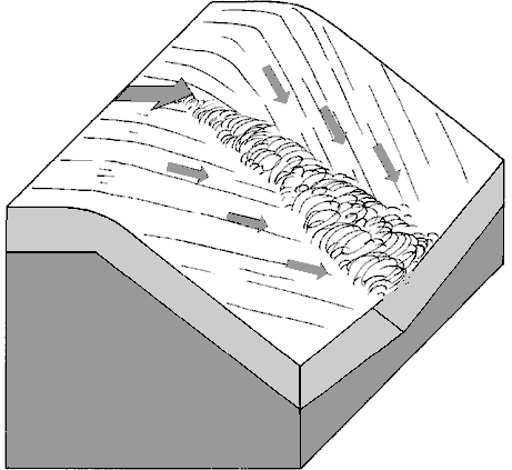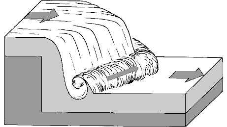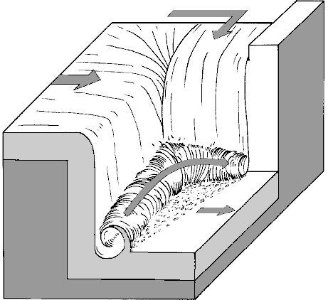 | Ломаный ступенчатый слив. В отличие от предыдущего случая, он не проходится по одной прямой от начала до конца. Сливы с разных ступеней могут быть повернуты под углом друг к другу, и в процессе падения с такого слива каякер вынужден четко ориентироваться и вовремя менять курс. | |