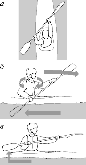 Прямой гребок: а - исходное положение, б - движение корпуса и рук во время гребка, в - положение рук и корпуса в момент перехода к следующему гребку. Конечное положение плеч является исходным для следующего гребка. |