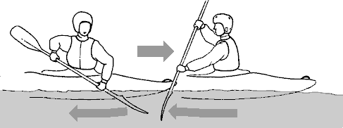 Обратная гребля используется для двух основных целей: чтобы заставить лодку равномерно двигаться (относительно воды) кормой вперед и чтобы быстро затормозить ее. В первом случае гребки должны быть более длинными и равномерными, во втором - короткими, отрывистыми, чтобы вращение лодки было минимальным. Замедляясь, лодка все-таки продолжает двигаться вперед, поэтому и смотреть в этом случае надо вперед - на препятствие. Ни в том, ни в другом случае обратная гребля не имеет ничего общего с морским словом "табанить", который неопытные туристы охотно заимствуют из гребли на распашных шлюпках. Этот термин означает "опустить весла в воду и использовать их как пассивный тормоз", поскольку приложить значительное усилие в противоположном направлении гребцы не могут, да и ситуация менее динамичная, чем на бурной воде. Каякер же должен интенсивно грести в противоположном направлении.