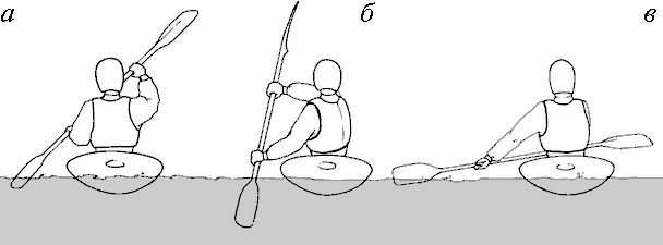 Положение весла при прямом (а), обратном (б) и дуговом (в) гребках. |