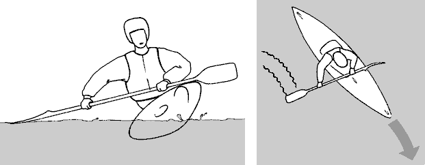 Роль весла при этом гребке состоит в том, чтобы дать вам дополнительную опору, когда вы крените лодку, поэтому оно должно лежать на воде почти горизонтально. Передний край лопасти должен быть приподнят всего на несколько градусов, чтобы она работала наподобие крыла самолета. Крен необходим для того, чтобы запустить каяк по пологой дуге. Кроме того, крен внутрь поворота необходим при поворотах в движении.