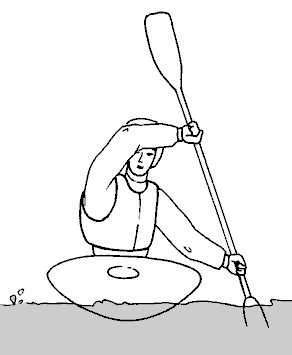 - Когда весло, наконец, подходит к носу каяка, ваша нижняя рука и плечи оказываются готовы для прямого гребка. Вам остается только вернуть верхнюю руку на ее обычную сторону, чтобы окончательно занять исходное положение, и выполнить прямой гребок. Если ваш корпус наклонен вперед, то сейчас вы его распрямляете, усиливая гребок. Этот гребок, называемый контрольным, необходим практически во всех маневрах, которые приходится выполнять туристу. Он выполняет две функции: проталкивает лодку вперед и останавливает дальнейшее вращение.