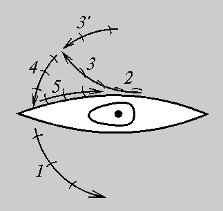 Движение весла при зацепе: 1 - дуговой гребок, 2 - разгон лопасти, 3 - параллельное притяжение, 4 - прямое притяжение носа, 5 - контрольный гребок, 3' - "туристский" вариант зацепа. |