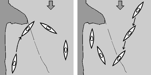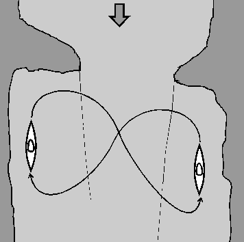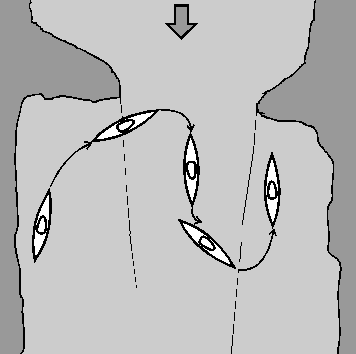 Таким образом, наиболее сложным оказывается вход в узкое улово. В этом случае каякеру следовало бы направить лодку с небольшой скоростью под углом, близким к прямому. Однако при этом возникает и максимальный опрокидывающий момент, и поддерживать равновесие при таком заходе наиболее сложно. Кроме того, из-за малой скорости лодка долго проходит через сбойку. С одной стороны, это позволяет ей приобрести больший вращательный момент, но с другой - подвергает ее воздействию турбулентности на границе, что также осложняет управление.