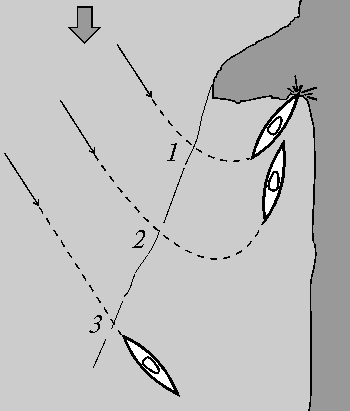 Другое соображение, определяющее точку входа - наличие камней и других препятствий. Прежде всего это относится к тому препятствию, которое образует данное улово. Если вы будете заходить в улово вплотную к его верхнему концу, это препятствие помешает вам выполнить разворот. Поэтому заход в улово обычно выполняется, как минимум, на полкорпуса ниже препятствия. С другой стороны, чтобы не промахнуться мимо улова, необходимо учитывать снос лодки по течению в процессе разворота - особенно при большой скорости основного потока и остром угле входа. Из этих соображений крайне нежелательно целиться в самый нижний конец улова.