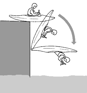 Другая особенность, не столь непременная - это малая начальная скорость прыжка. Здесь также следует соблюдать осторожность. При старте без начальной скорости с высокого отвесного берега или с моста лодка на кромке обрыва разворачивается носом вниз. Это вращение может по инерции продолжаться в полете, и в конце концов каяк падает на воду кверху дном. В зависимости от того, каким образом он реально приводнится - под острым углом или плашмя - результат может варьироваться от легкого психологического дискомфорта до серьезной травмы. Поэтому желательно выбирать для тюленьего старта гладкую наклонную плиту, по которой лодка может разогнаться, прежде чем оторвется от ее края.