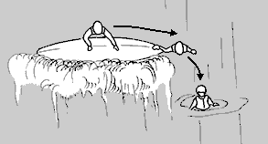 Пловец удерживается, например, в бочке, а лодка случайно или преднамеренно направлена так, что проходит эту бочку. Оказавшись на выносном течении, она вытаскивает за собой пловца.