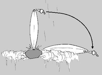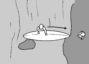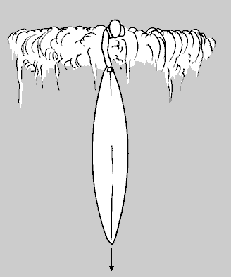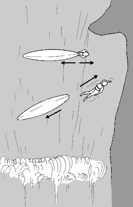 Нос лодки упирается в камень, пловец находится у кормы, выше по течению. Из этого неустойчивого положения поток разворачивает лодку на 90°, при этом пловец смещается вбок на длину корпуса лодки.